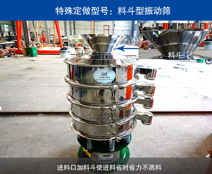 進料口加料斗型振動篩是在普通振動篩的進料口上蓋上加裝一個漏斗型的進料斗,可以在人工加料時節省時間力氣并且進料過程中不會灑料造成物料的浪費。