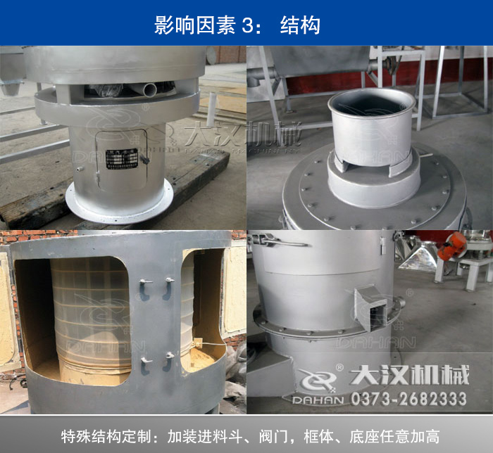 碳化鎢粉氣流篩分機的結構也是影響價格的重要的因素,大漢振動篩支持產品特殊設計定制,可以根據您的要求在出料口加閘門型或是框體、底座加高,進料口加料斗等,同時在篩網的目數上也有很多選擇,80-530目各種粉狀物料篩選分級,功能非常的強大,所以結構越復雜,價格就會對應增加。