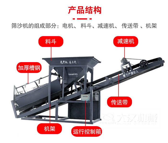 篩沙機(篩沙船)的組成部分:電機、 料斗、減速機、 傳送帶 、機架、 轉篩、 傳送桿 。