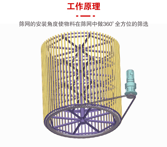 物料從料斗進入滾篩中,經過篩網網孔大小的篩選以及電機帶動軸承于篩網的滾筒,能夠保證物料在篩網中做360°全方位的篩選,同時經過篩網選出的物料就會,經皮帶輸送機,輸送到固定的沙堆或者直接裝車運走,沒有篩出的物料就會隨篩筒滾動到篩尾,從廢料口流出。